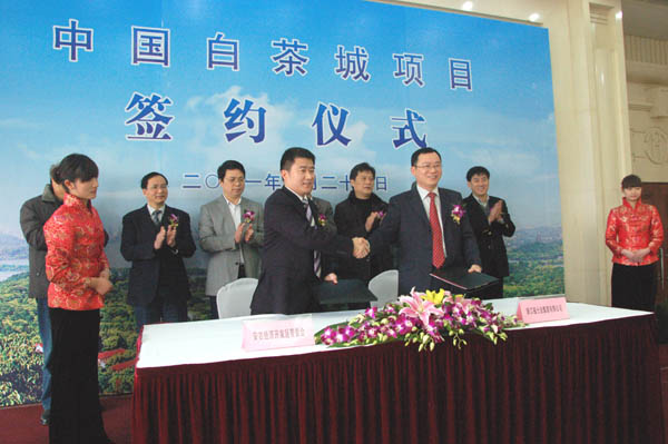 在新春佳節即將來(lái)臨之際,2011年1月29日,“中國白茶城”項目簽約儀式在杭州大華飯店舉行。簽約雙方代表安吉縣經(jīng)濟開(kāi)發(fā)區管委會(huì )常務(wù)副主任祝海燕和浙江福士達集團有限公司、浙江省茶葉集團股份有限公司董事長(cháng)施建強在項目合同上簽字。省供銷(xiāo)社副主任、興合集團總裁何忠民主持儀式,省供銷(xiāo)社主任、興合集團董事長(cháng)史濟錫、安吉縣政府副縣長(cháng)凌建榮在儀式上致辭,施建強董事長(cháng)介紹項目情況。省農業(yè)廳總農藝師王建躍、省供銷(xiāo)社副巡視員王東方、省茶葉產(chǎn)業(yè)協(xié)會(huì )常務(wù)副會(huì )長(cháng)沈漩、秘書(shū)長(cháng)胡迪鈞出席儀式。