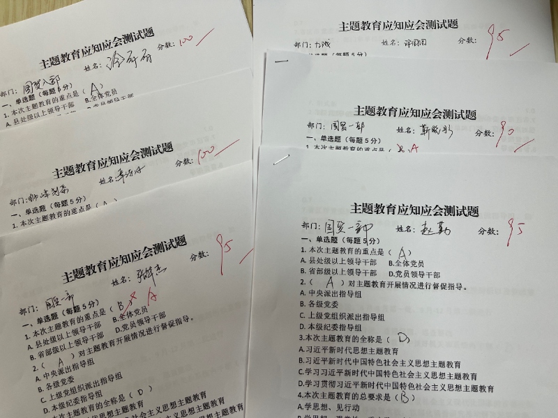 為檢驗近段時(shí)間黨員對于學(xué)習貫徹習近平新時(shí)代中國特色社會(huì )主義思想主題教育的理解程度,提高黨員對于理論知識學(xué)習的積極和熱情,6月16日,浙茶集團第四黨支部開(kāi)展《主題教育應知應會(huì )測試題》答題活動(dòng)。支部全體黨員,入黨積極分子參加答題活動(dòng)。